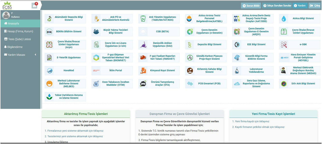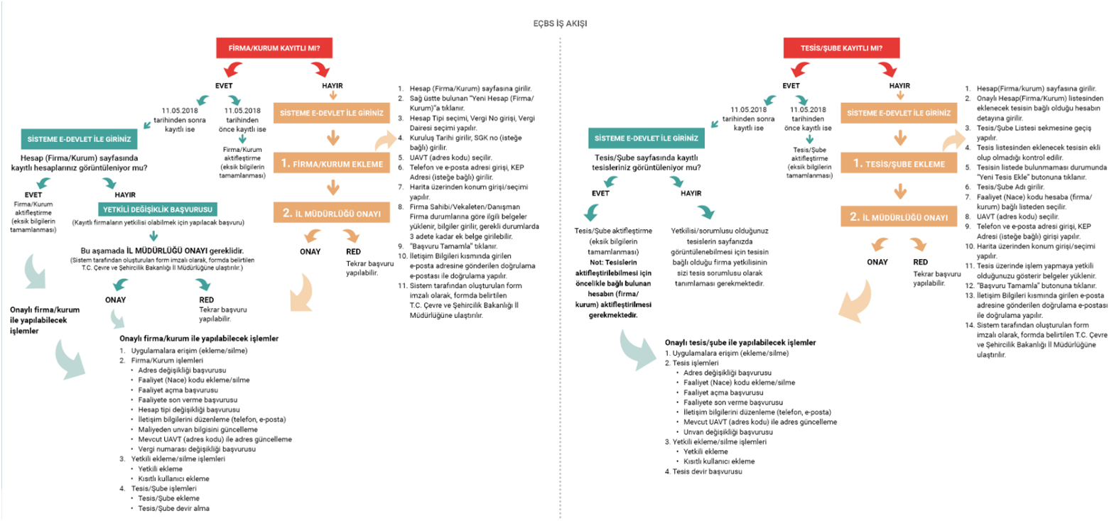 Firma/kurum kaydolmak için imza yetkisi bulunan firma yetkilisi tarafından EÇBS’ ye e-devlet şifresi ile giriş yapar. Şirket bilgileri girildikten sonra sistem tarafından otomatik olarak kayıt formu oluşturulur. Bu kayıt formu firma yetkilisi tarafından kaşelenip imzalandıktan sonra bağlı bulunulan Çevre, Şehircilik ve İklim Değişikliği İl Müdürlüğüne verilir. İl müdürlüğü kontrollerini sağladıktan sonra entegre çevre bilgi sistemi üzerinde firma kaydı aktif hale getirilir.